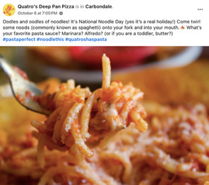 If pictures of cheesy pizza don't make you hungry, we're not sure what will, because so far it's been working for Quatro's! We run the Quatro's social media accounts with gusto and cheese writing the content, staging and shooting the pictures, and helping our client to bring in even more hungry people to eat their delicious pizza (we're hungry now just thinking about it).